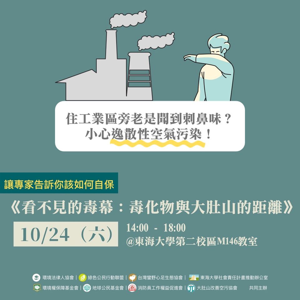 10月24日(六)14:00至16:00,東海大學社會責任計畫推動辦公室與大肚山改善空污協會、財團法人環境權保障基金會共同主辦,辦理場次三《看不見的毒幕:毒化物與大肚山的距離》講座,以環境優美著稱的東海校園,卻因身處台中工業區與中科之間,空氣經常瀰漫臭味,影響身心健康,卻因為未達法規標準而難以開罰,令人無奈與氣憤。