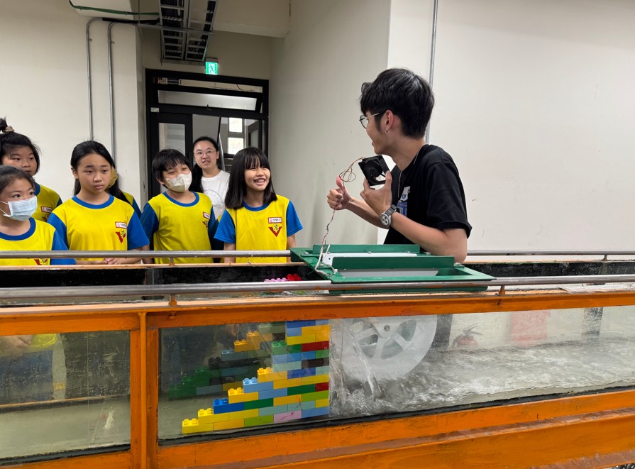 河溪不僅有供給水源、氣候調節與生物棲息功能,利用河川的地形差異,更可設置水力發電設施發展綠色能源。本計畫結合逢甲、中興、中教大組成四校聯盟,各校發揮研學專長推動河川的永續。逢甲水利系黃振家教授此次帶領該校愛護水資源社學生,以深入淺入的活潑方式,說明如何利用河川的高低差帶動渦輪機運轉,進而透過電磁感應轉化成電能。為了加深學生理解,使用樂高積木指導各組學童建造自己的堤壩,再前往土木水利館的專門教室實際運轉。經由實際操作,學童不僅更理解水力發電原理,也能拓展對河溪各種功能的多重想像。